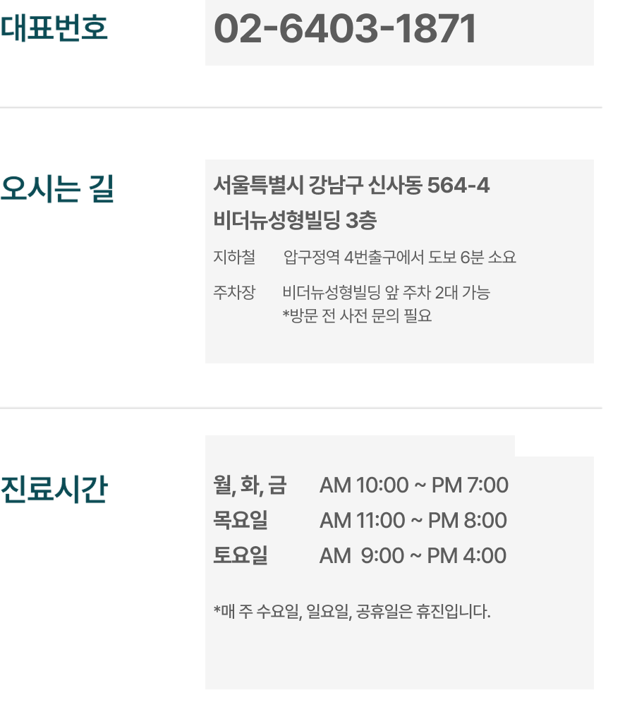 주소 : 서울특별시 강남구 신사동 564-4 비더뉴성형빌딩 3층