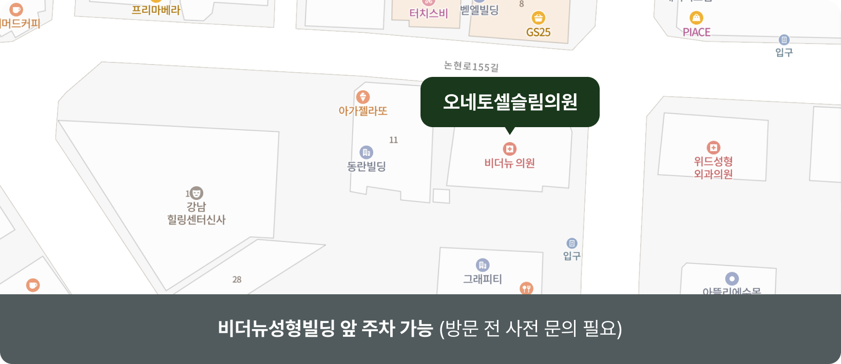 오네토셀슬림의원을 방문해주시는 분들께서는비더뉴성형빌딩 앞 주차 공간을 이용해주세요.